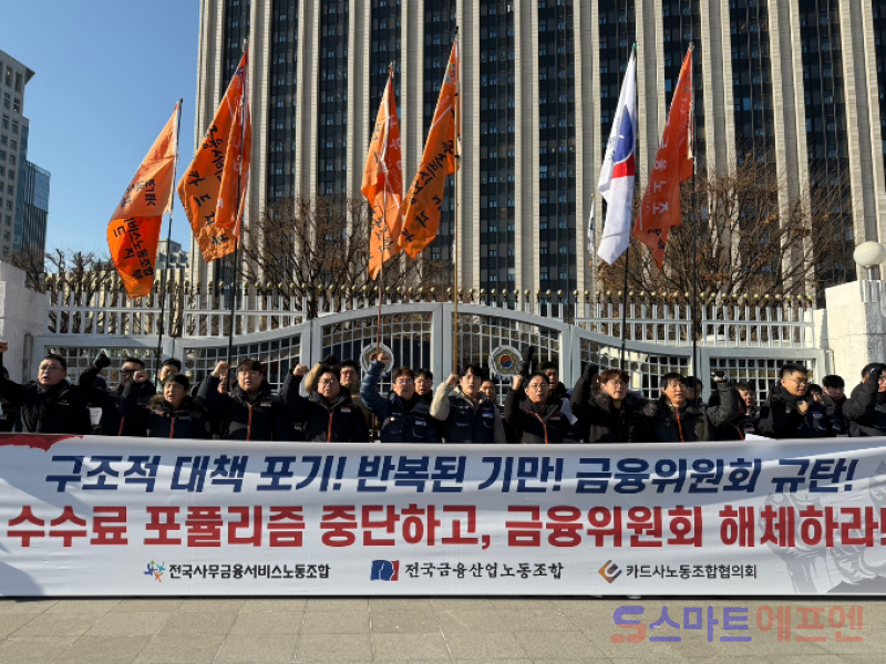 전국사무금융서비스노동조합, 전국금융산업노동조합, 카드사노동조합협의회는 19일 오전 금융위원회 앞에서 기자회견을 열고 "금융위 해체"를 요구했다.