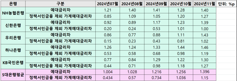 모든 예금과 대출을 포함한 수치인 예대금리차 평균(5대 은행 기준)은 1.396%p였다. 이 수치 역시 넉 달 연속 증가했다.