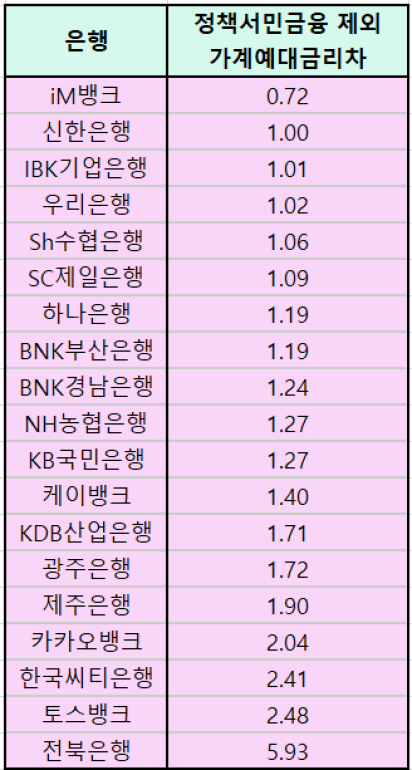 지난 27일 은행연합회 소비자포털의 '예대금리차비교'에 따르면 공시에 참여한 19개 은행 중 11월에 가계예대금리차(정책서민금융 제외)가 가장 낮았던 은행은 iM뱅크(0.72%p), 가장 높았던 은행은 전북은행(5.93%p)이다.
