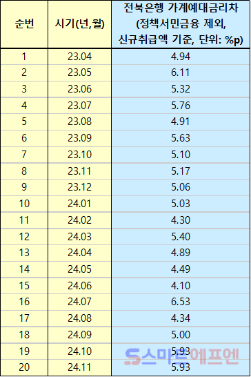 전북은행의 20개월 평균 가계예대금리차는 5.20%p로 집계됐으며, 지난해 5월 최고치인 6.11%p까지 치솟았다가 지난 11월엔 5.93%p를 기록했다.