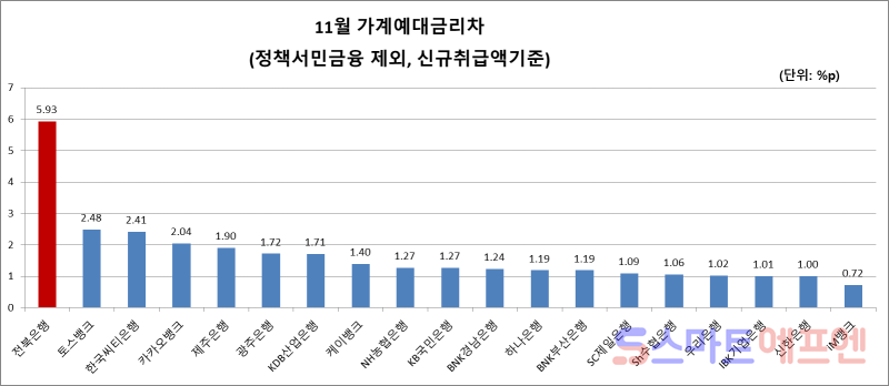 전북은행의 수신금리는 보통 수준이지만 가계대출금리는 가장 높았다. 전북은행의 11월 저축성수신금리는 3.37%로 1금융권의 19개 은행 중 8번째로 높았던 반면, 같은달 가계대출금리는 9.30%였다. 가계대출금리가 두번째로 높았던 토스뱅크보다 3.81%p 높았던 것이다.