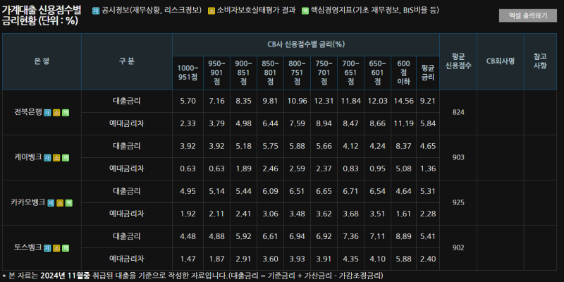 11월 가계대출 신용점수별 평균금리를 비교하면 ▲전북은행 9.21% ▲케이뱅크 4.65% ▲카카오뱅크 5.31% ▲토스뱅크 5.41%였다.