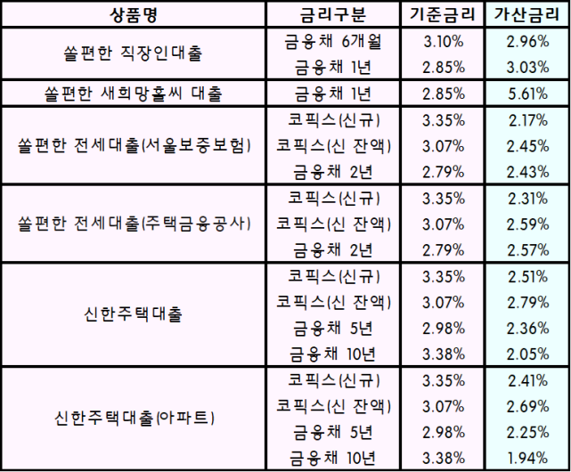 신한은행은 주택담보대출(지표금리 금융채 5년물) 가산금리에서 각각 ▲주택구입자금 대출 0.1%p ▲생활안정자금 대출 0.05%p씩 인하한다.
