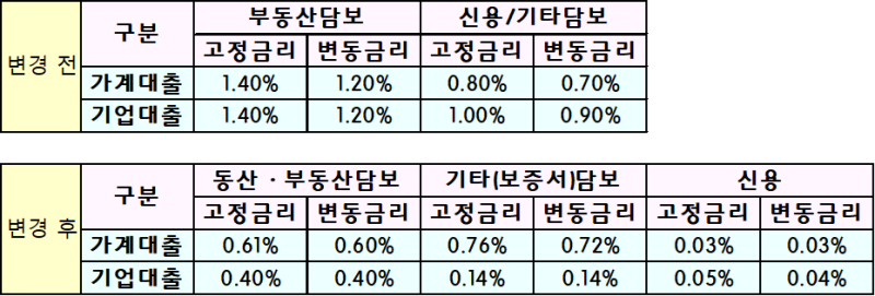 가계대출의 경우 고정금리 기준으로 ▲동산·부동산 담보는 1.4% → 0.61% ▲기타 담보 0.8% → 0.76% ▲신용 대출 0.8% → 0.03%로 변경된다. 변동금리 기준으로는 ▲동산·부동산 담보 1.2% → 0.60% ▲기타 담보 0.7% → 0.72% ▲신용 대출 0.7% → 0.03%로 달라진다.