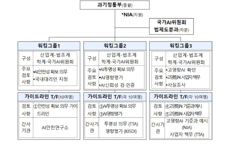 과기정통부는 AI기본법 제정의 효과를 민간에서 체감할 수 있도록 하기 위해 하위법령 정비단은 구성·운영한다. 정비단은 과기정통부와 산업계·학계·법조계 전문가들을 비롯해 국가인공지능(AI)위원회 법제분과로 구성된다.