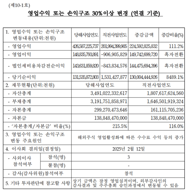 12일 토스증권의 '영업수익 또는 손익구조 30% 이상 변경 (연결 기준)' 공시에 따르면 지난해 당기순이익은 약 1315억원으로, 2023년(15억3000만원)에 비해 8489.1% 증가했다.