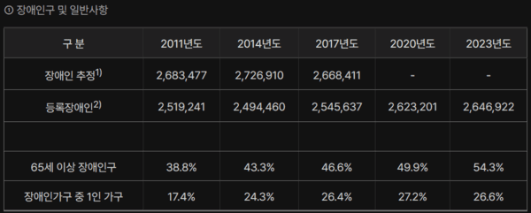 보건복지부가 실시한 장애인실태조사에 따르면 2023년 기준 국내 장애인 인구는 대한민국 전체인구의 5% 정도인 약 264만7000명이다. 장애인 월평균소득은 전국 가구 평균소득(483만4000원)의 63%인 약 305만8000원이다.