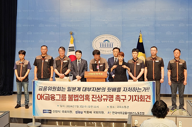 전국사무금융서비스노조 OK금융그룹지부(이하 노조), 신장식 조국혁신당 의원, 박홍배 더불어민주당 의원 등은 3일 오전 국회소통관에서 'OK금융그룹 불법의혹 진상규명 촉구 기자회견'을 열고 "금융위원회는 일본계 대부자본의 뒷배인가?"라고 질타했다.
