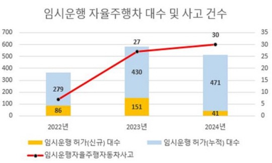 이에 따라 자율주행차 교통사고 건수도 2022년 7건, 2023년 27건, 지난해 30건 등 매년 늘고 있다.