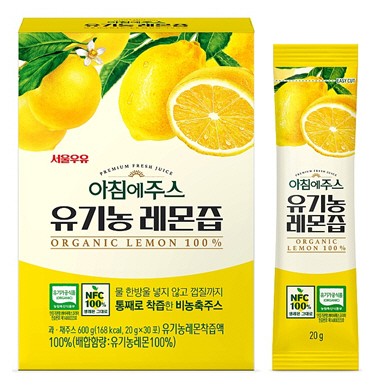 서울우유 ‘아침에주스 유기농레몬즙’은 NFC(Not From Concentrate) 방식으로 생산된 100% 과채주스로, 물 한 방울 넣지 않고 레몬을 껍질째 통째로 착즙한 것이 특징이다. 한 포에 레몬 한 개 분량이 그대로 담겨 있고, 휴대성이 뛰어나다.