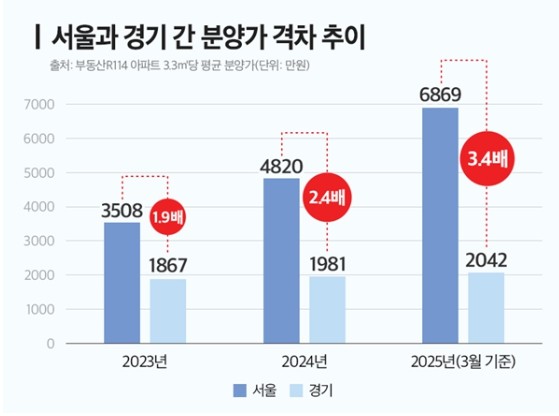 31일 부동산R114에 따르면 올해(3월 말 조회 기준) 서울 아파트 3.3㎡당 평균 분양가는 6869만원으로 경기도(2042만원)의 3배를 넘어섰다. 전용면적 84㎡(약 34평) 기준으로 계산했을 때 무려 16억원 이상 차이 나는 금액이다.