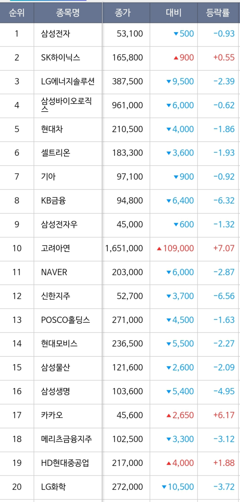 반면, SK하이닉스는 0.55% 상승했고, 고려아연은 치열한 경영권 분쟁이 벌어지면서 7.07%의 상승률을 기록했다. 이는 20대 기업 중 가장 큰 폭의 상승세다.