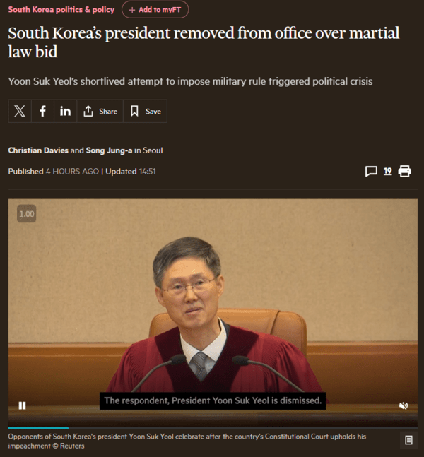 파이낸셜타임스(FT)는 "대한민국의 윤석열 대통령이 계엄령 선포를 시도한 지 4개월 만에 파면됐다"며 "이는 장기화된 정치적 위기의 끝을 알리는 조치"였다고 보도했다.
