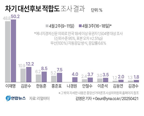 여론조사업체 리얼미터는 에너지경제신문 의뢰로 지난 16~18일(4월 3주차) 전국 18세 이상 유권자 1504명을 대상으로 차기 대선주자 적합도 조사를 실시한 결과
