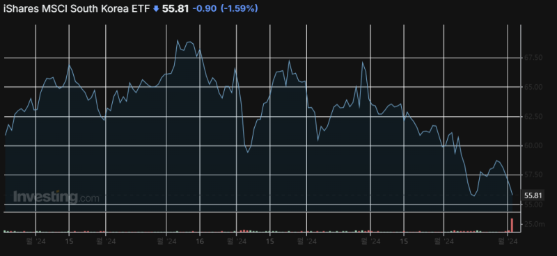 인베스팅닷컴에 따르면 3일(현지 시각) 한국의 주요 대형주와 중형주 100여개를 추종하는 아이셰어즈 MSCI 한국 ETF(EWY)는 장중 최대 6.01% 하락하며 52.68달러까지 떨어져 52주 최저치를 기록했다.