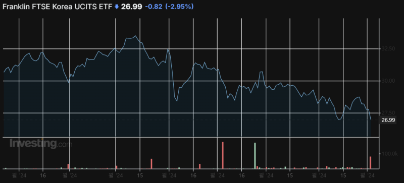 다른 한국 관련 ETF들도 비슷한 흐름을 보였다. 프랭클린 FTSE 한국 UCITS ETF(FLXK)는 장중 8.29% 하락한 25.77달러까지 떨어졌다가, 26.99달러로 반등해 2.95% 하락으로 마감했다. FLXK도 한국의 주요 대형주와 중형주에 투자하는 ETF다.
