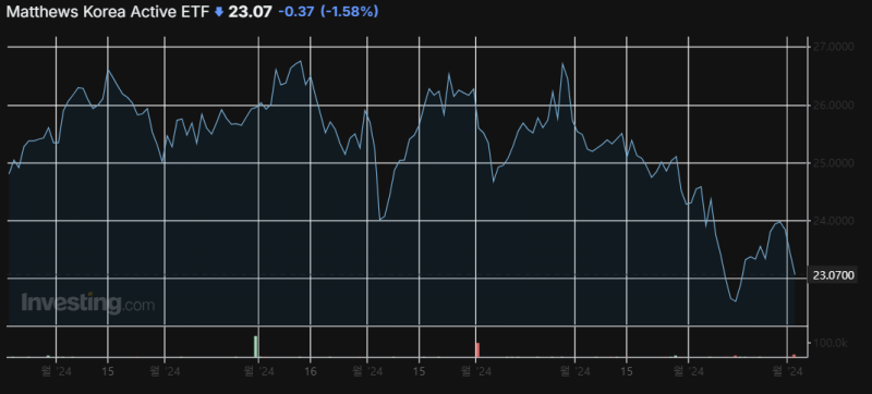 한국의 성장주 30여개에 투자하는 매튜스 한국 액티브 ETF(MKOR) 역시 장중 4.97% 하락했으나, 23.07달러로 회복되며 전일 대비 1.58% 하락에 그쳤다.