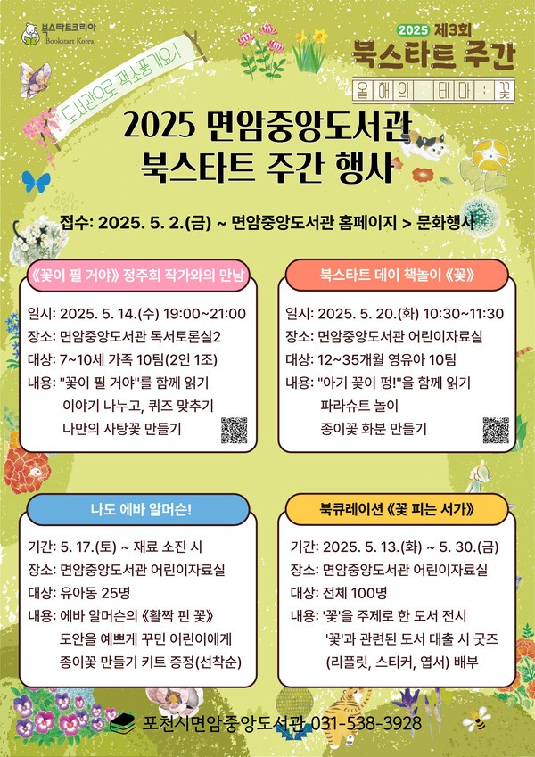 이번 북스타트 주간 행사에는 아이와 부모가 함께 참여할 수 있는 도서관별 특색 있는 만남이 준비됐다. 면암중앙도서관에서는 '꽃이 필 거야' 정주희 작가와의 만남, 일동도서관에서는 '꽃살문' 김지연 작가와의 만남, 소흘도서관에서는 '꽃점' 문명예 작가와의 만남이 예정돼 있다.