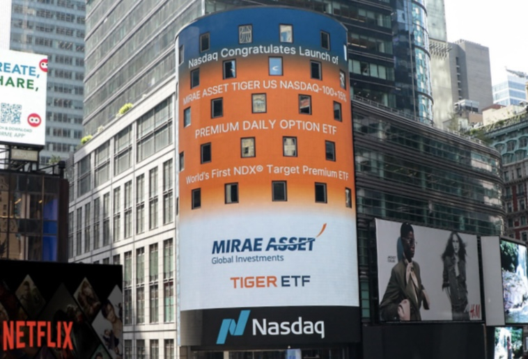 지난 20일(현지시간) 미국 나스닥 전광판에 새겨진 미래에셋자산운용의 'TIGER 나스닥 100+15%프리미엄 초단기 ETF'. 나스닥이 이 같은 구성의 상장지수펀드(ETF)는 세계 최초(World's Frist)라고 축하해주고 있다. 사진=미래에셋자산운용권오철 기자 konplash@smartfn.co.kr