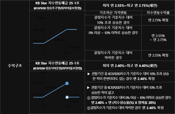'KB Star 지수연동예금 25-1호'는 코스피200 지수를 기초자산으로 하는 1년 만기 상품으로, '상승추구형'과 '상승낙아웃형' 두 가지 유형으로 구성된다.