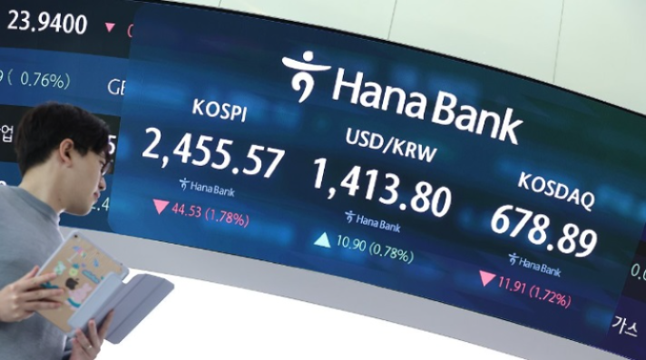 지수는 전장보다 49.34포인트(1.97%) 내린 2,450.76으로 출발해 1%대 후반의 하락률을 기록하고 있다.
