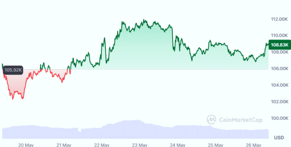 26일(한국시간) 가상자산 정보 웹사이트 코인마켓캡에 따르면 이날 오전 9시35분 기준 비트코인 1개의 가격은 전날보다 0.89% 상승한 약 10만8961달러로 집계됐다.