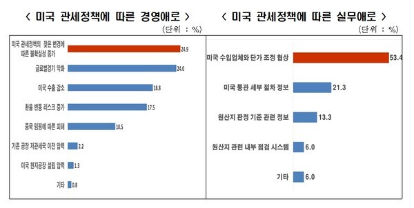 한경협이 1000대 매출 기업 중 수출기업 150곳을 대상으로 실시한 조사 결과, 기업들은 관세정책 변경에 따른 불확실성 증가(24.9%), 관세분쟁으로 인한 경기 악화(24.0%), 수출 감소(18.8%) 등을 주요 경영 애로 요인으로 꼽았다.