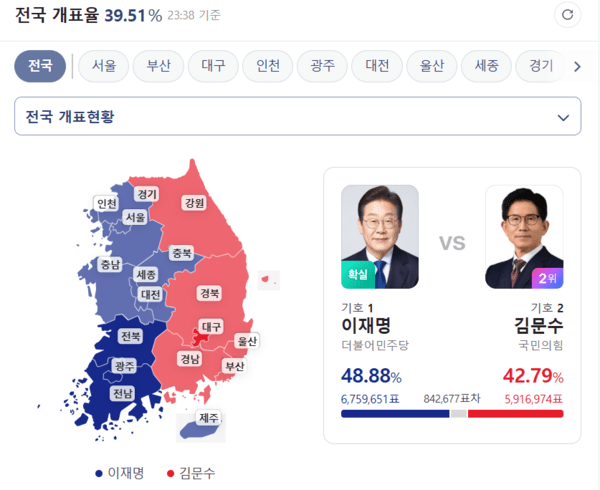 전국 개표율이 40%에 육박하면서 이재명 더불어민주당 대선 후보가 득표율 48.88%를 달성하며 당선이 확실해졌다. 김문수 후보는 42.79% 득표율을 기록했다. 두 후보간 표차는 84만2677표다.