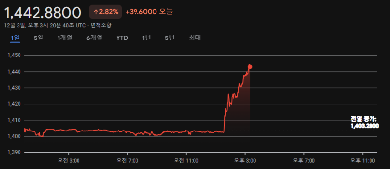 4일 0시 20분 기준 원달러 환율이 1442.88원을 기록중이다. 자료=구글 금융 윤석열 대통령이 3일 비상 계엄을 선포한 이후 원달러 환율이 1440원을 넘어섰다. 이날 종가 1402.9원였던 원달러 환율은 비상 계엄 선포 이후 4일 0시 20분 기준 1442.88원을 기록 중이다. 김준하 기자 guyblue@smartfn.co.kr