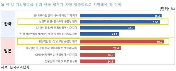 보고서는 미래 첨단소재·부품·장비(소부장) 산업에서 협력 수요가 높아질 것으로 전망했다. 실제로 한국 기업의 47.4%, 일본 기업의 59.2%가 소부장 공급망 협력을 최우선 과제로 꼽았다.