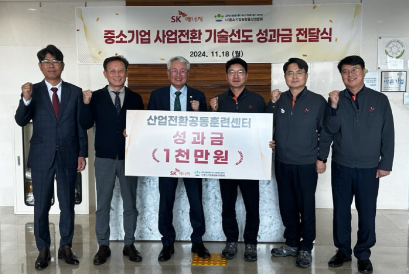 SK 울산CLX는 지난 18일 '중소기업 사업전환 기술선도 성과금 전달식'을 가졌다. 이 자리에는 채종성 중소기업융합울산연합회장, SK산업전환공동훈련센터 구성원들이 참석했다.