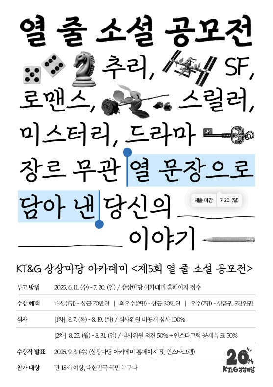 | 스마트에프엔 = 김선주 기자 | KT&G 상상마당이 문학 저변 확대를 위한 ‘제5회 열 줄 소설 공모전’의 참가자를 오는 7월 20일까지 공개 모집한다고 9일 밝혔다.
