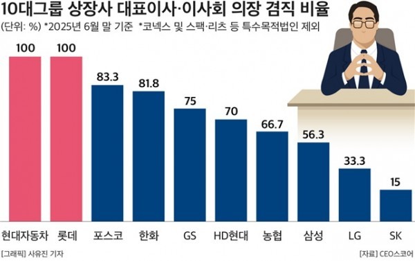 10대 그룹 내에서는 SK그룹이 상장 계열사 20곳 중 15곳(75.0%)에서 사외이사를 이사회 의장으로 선임해 가장 높은 비중을 기록했다. 반면 현대자동차그룹과 롯데그룹은 각각 12곳, 10곳의 상장 계열사 전부에서 대표이사가 의장을 겸직하고 있었다.