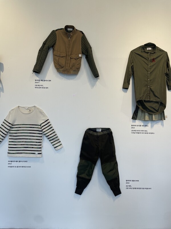 ‘밀리터리 컬렉션’에서는 군용 텐트와 낙하산 원단을 활용한 다양한 작품이 전시됐다. 전시장 안쪽으로 들어가면 실생활에서 착용가능한 제품들도 만날 수 있다. 카모플라주 패치가 더해진 줄무늬 티셔츠, 군용 바지를 재조합해 만든 셔츠 원피스 등은 밀리터리 소재의 기능성과 감성을 동시에 담아냈다.