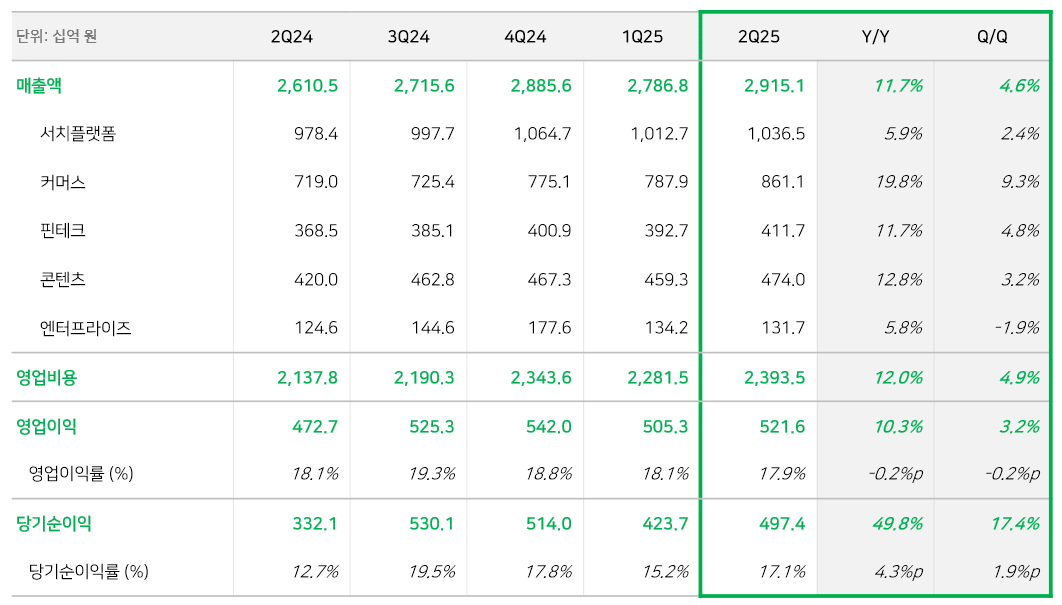 2분기 연결 매출액은 서치플랫폼, 커머스 등 주요 사업 부문의 견조한 성장으로 전년 동기 대비 11.7% 증가했다. 연결 영업이익은 전년 동기 대비 10.3% 증가했다.