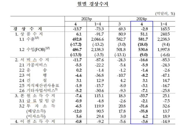 다만 1∼4월 누적 경상수지는 165억5000만달러로 전년 동기(-73억3000만 달러) 대비 238억8000만 달러 개선됐다.