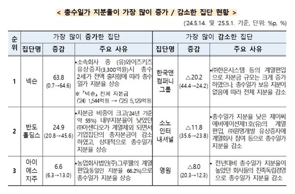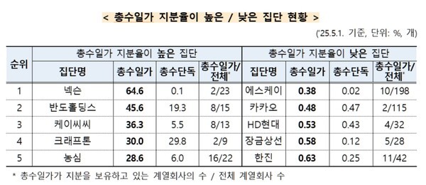 총수 개인 지분율은 크래프톤(29.8%), 부영(23.1%), 반도홀딩스(19.3%) 등이 높게 나타났고 총수 2세 세대의 독점적 지배는 넥슨(64.5%)에서 두드러졌다. 세습 경영의 고리가 시장 논리를 압도했다.