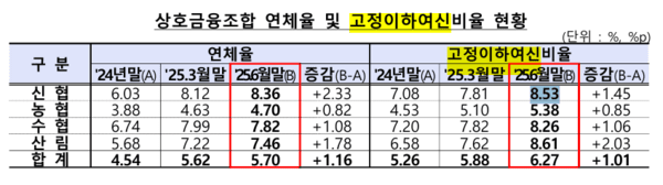 반면 상호금융은 지방 부동산시장 부진의 영향으로 고정이하여신비율이 7.19%에서 7.40%로 상승했다. 올해 6월 말 기준 5대 상호금융의 고정이하 여신비율은 농협 5.38%, 신협 8.53%, 수협 8.26%, 산림조합 8.61%, 새마을금고 10.73%%로 집계됐다.