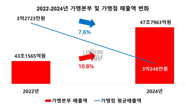 성장 불균형은 시장 포화와 비용 구조 변화, 본사와 가맹점 간 수익 배분의 불균형 문제를 반영한다는 분석이 나온다. 가맹점은 증가하고 있지만 점포별 실질 매출은 줄어든 반면 본사는 매출과 이익이 증가하는 구조가 지속되고 있다.