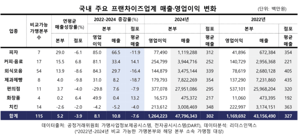 10일 기업분석연구소 리더스인덱스가 공정거래위원회 가맹사업정보제공시스템과 전자공시시스템을 통해 7개 업종 115개 가맹본부와 9만2885개 가맹점의 3년치 데이터를 분석한 결과, 7개 업종 전체 가맹점 수는 6.6% 증가했지만 점포당 연평균 매출은 7.6% 감소했다.