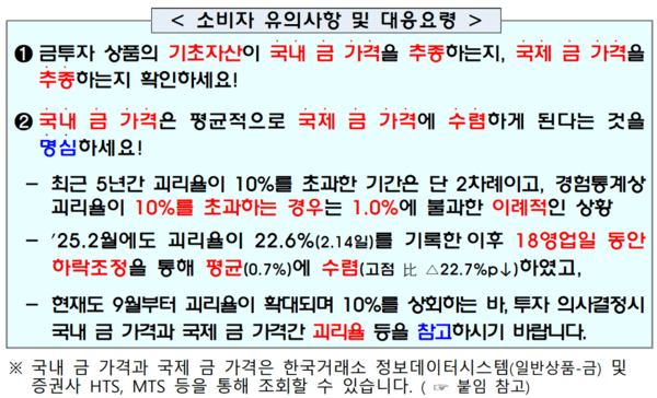 금감원은 "국내 금 가격은 제한된 수급 요인과 정보 불완전성 등으로 인해 일시적 괴리가 발생할 수 있지만, 일물일가의 법칙에 따라 장기적으로는 국제 금 가격과 수렴할 수밖에 없다"고 설명했다. 실제로 올해 2월 약 30영업일 동안 국내 금 가격은 국제 금보다 최대 22.6% 비쌌으나, 이후 18영업일 동안 하락해 평균 괴리율(0.7%) 수준으로 하락했다.
