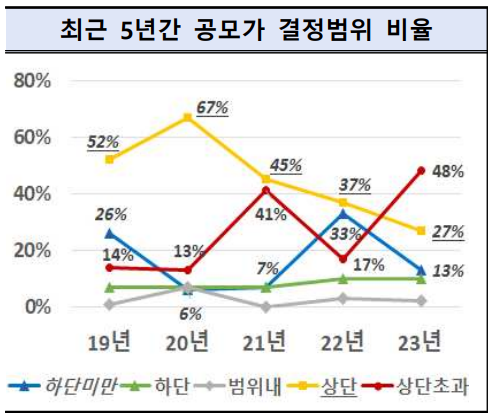 금감원의 ‘2023년 IPO 시장동향 분석’에 따르면 지난해 밴드 상단을 초과하는 공모가의 비율은 48%로, 지난 5년 중 가장 높은 수치다. 수요예측에서 제시된 밴드가 사실상 유명무실하다는 지적이 나오는 이유다.