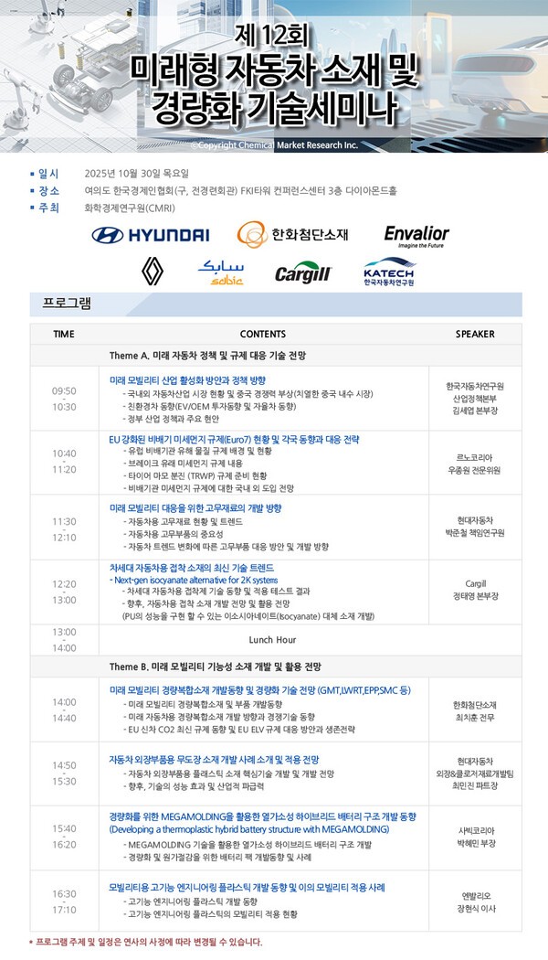 현대자동차, 르노코리아, 한화첨단소재, 사빅코리아, 엔발리오 등 국내외 완성차·소재 업계 전문가가 강연을 진행한다.