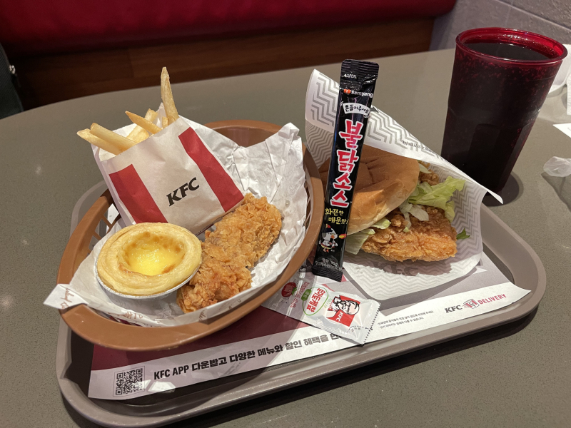 구성은 ▲삼양불닭소스 ▲핫크리스피통다리 ▲에그타르트 ▲프렌치프라이M ▲스프라이트 기본 구성에 ▲칠리 징거 통다리로 한 사람이 먹기에는 매우 버거운 양이다. 개개인의 취향에 맞게 소스를 가감할 수 있는 점이 만족스러웠다.