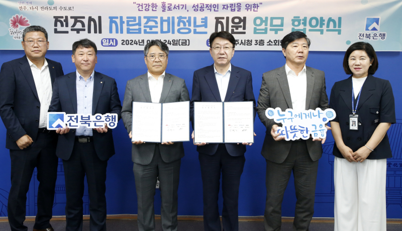 시와 전북은행은 24일 전주시장실에서 우범기 전주시장과 백종일 전북은행장 등 양 기관 관계자들이 참석한 가운데 자립준비청년의 지원을 위한 업무협약을 체결했다.