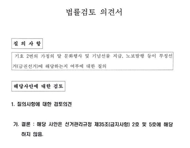 선관위 관계자는 본보의 이 같은 질문에 "법률검토 의견서는 참고하는 자료일 뿐"이라며 "그 의견을 전적으로 신뢰하거나 그대로 따르진 않는다"고 말했다.