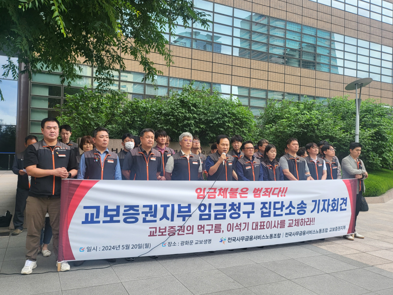 전국사무금융서비스노동조합 교보증권지부(이하 노조)는 20일 서울 종로구 소재 교보생명 본사 앞에서 기자회견을 열고 "교보증권 사측이 통상임금을 잘못 산정해 노동자들의 임금을 체불하고 있다"고 주장하며 이같이 말했다.