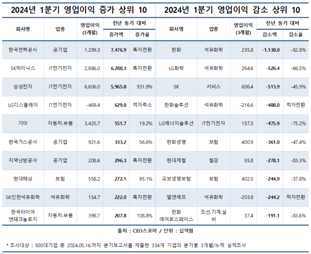 CEO스코어, 국내 500대 기업 2024년 1분기 실적 조사