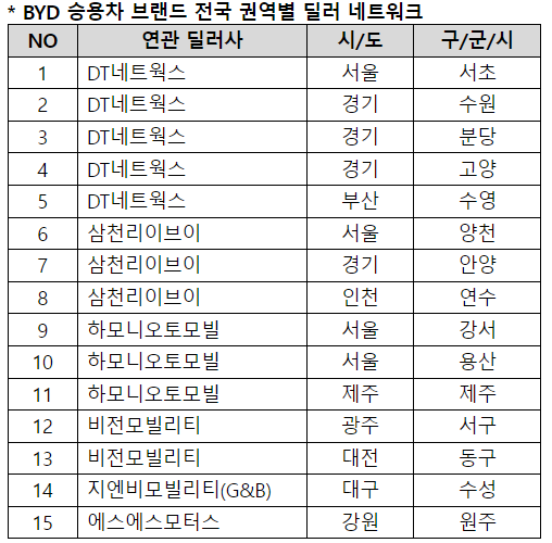 BYD코리아는 BYD 승용차의 판매를 담당할 딜러 파트너사로 DT네트웍스, 삼천리이브이, 하모니오토모빌, 비전모빌리티, 지엔비모빌리티, 에스에스모터스 등 6개사를 선정했다고 17일 밝혔다.