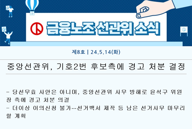 지난달 22~24일 치러진 전국금융산업노동조합(금융노조) 임원 보궐선거에서 당선된 윤석구 신임 위원장을 중심으로 출범한 새 금융노조 집행부가 중앙선거관리위원회(선관위)로부터 '경고' 처분을 받은 가운데, 해당 제재의 이유는 두 가지의 '선관위 사무 방해'인 것으로 확인됐다.